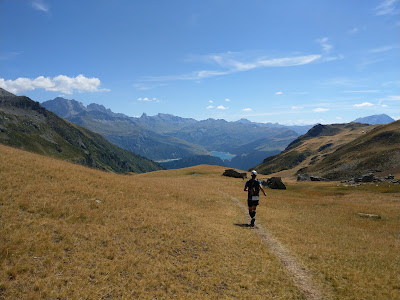I made it to the major aid station at Bourg Saint Maurice after 7.15h, and was asked by a volunteer at the entrance whether I was on my own or with a support crew. With a look of pity, he sent me straight to the buffet after my negative reply. I filled up with some solid food and stashed my torch (which I had to take out again when leaving the aid station for a mandatory gear check) before getting back on track after about 15 minutes, apparently just seconds before my brother also arrived at the checkpoint. Next on the menu was a pretty tough stretch: a roughly 2000m climb to the Passeur de Pralognan where in the previous year's edition a runner had died, with no official water sources, followed by a steep downhill to the Cormet de Roselend, for a total of 16km. Having carefully read the race details, I was able to manage my water consumption, but other runners hit very bad dry spells. On top of the first climb at the Fort de la Platte (~1200m+ in less than 6k), a lady had put up a stall selling Coke and Perrier for €5 per can, which quite a few people were desperate enough to shell out. I flung a gel at a collapsed American lying in the shade with whom it was impossible to tell whether he was in the final throes of bonking, dehydration or heat stroke (it was getting quite hot at 9 in the morning), and then got on with it.